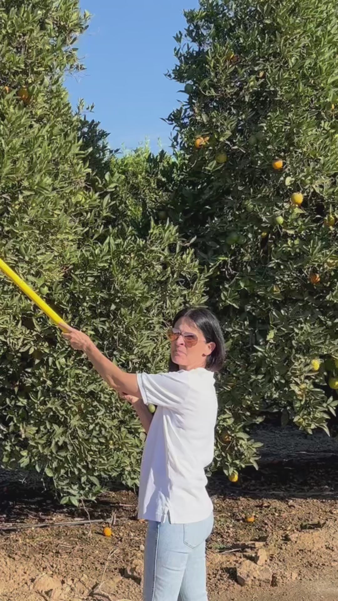 Safety is priority #1. To prevent injury, avoid power lines and do not work from a ladder. Use a long extension pole that allows you to stand clear of falling fruit and debris.